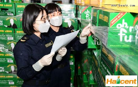 青岛海关关员在对出口啤酒进行现场查验